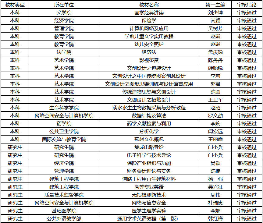 根据教育部《普通高等学校教材管理办法》《河北大学教材管理办法》等文件精神,为全面落实教材“凡编必审”,学校教材工作专家委员会召开会议,对各教学单位申报的2025-2026学年春学期31部拟出版教材进行了集中审议,其中27部教材通过审核,现将审核结果公布如下: